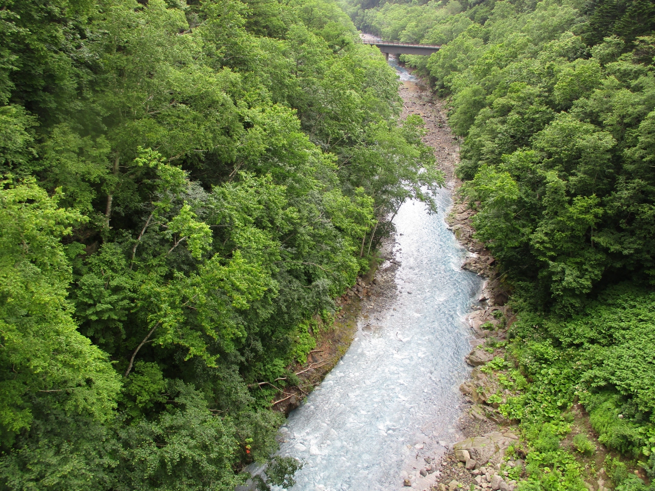 青い池の周辺にある白金温泉街にある白ひげの滝です。白ひげの滝は崖の途中から地下水が湧き出ており、地下水の中にアルミニウム成分を含んでいます。この滝が美瑛川と合流すると、目には見えないコロイド状の粒子が生まれて、太陽の光をまんべんなく散乱させるそうです。