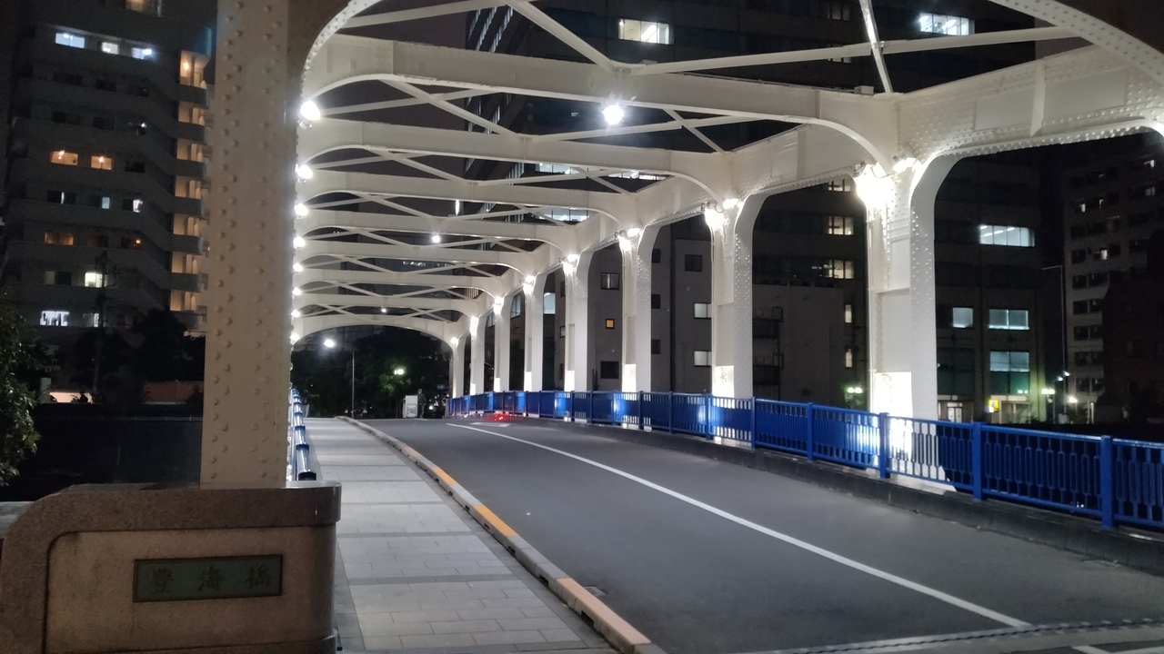 骨太な部材が格子状に組み合わされた豊海橋は、白色で統一され他の橋同様にライトアップされ、昭和2年の橋とは思えない雰囲気のある美しい橋でした。