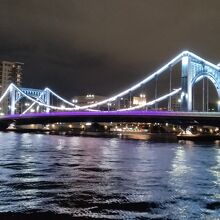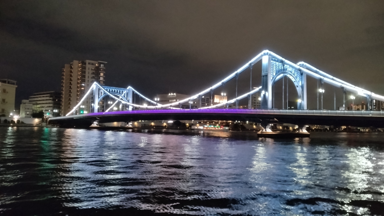 関東大震災の復興事業で造られた自碇式吊橋で、昭和3年に完成している。永代橋とともに、隅田川を代表する美橋として知られているがこの橋のライトアップはかなり美しい。