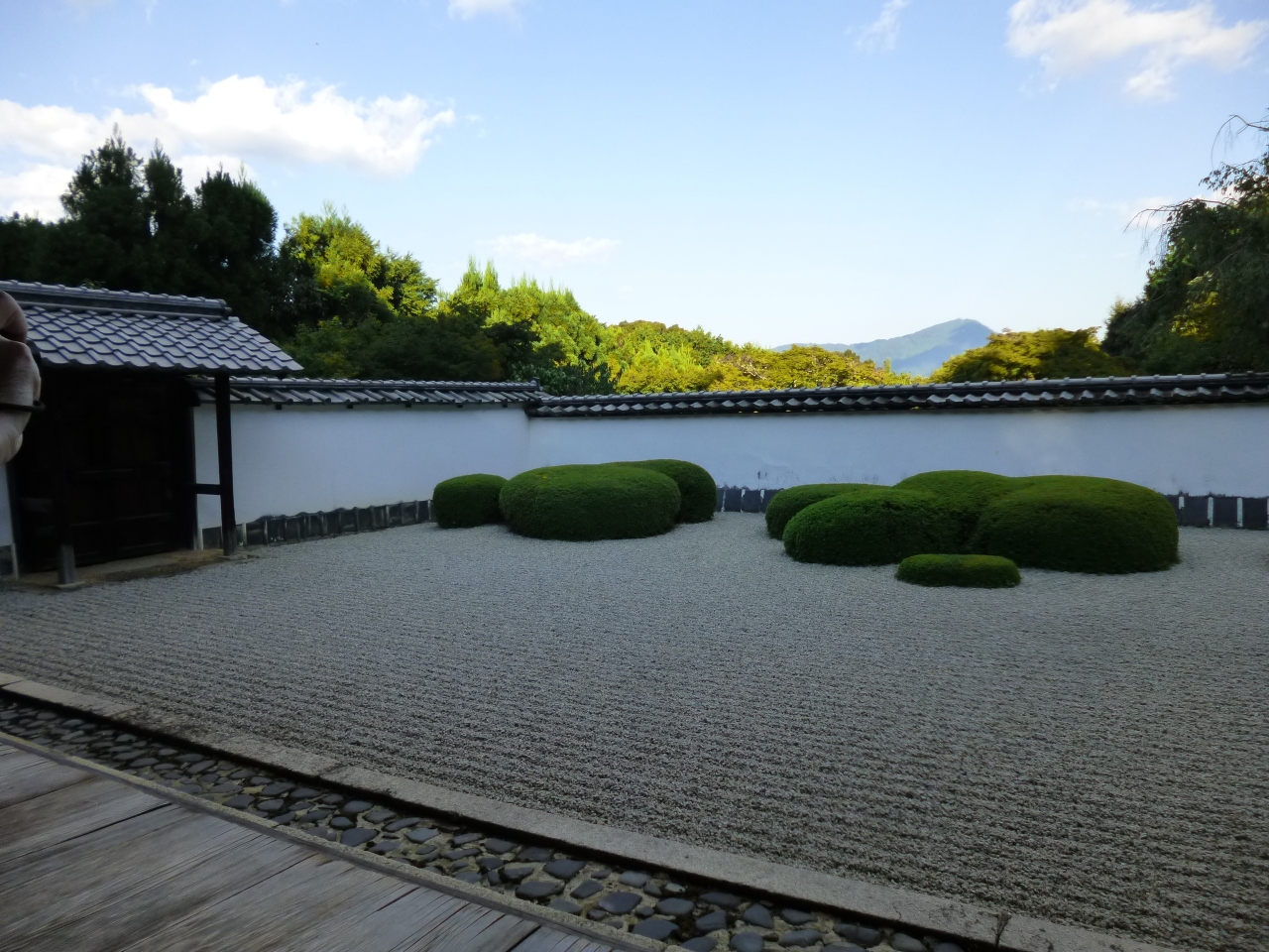 上加茂神社から西へ1.8kmくらいのところにあるお寺です。途中坂を上がって行き、最後は階段を上がります。鎌倉時代に創建されたお寺で、1652年伏見城から移築されたそうで重要文化財になっています。暑い日など、お寺に着くのは少し大変ですが、その疲れも吹き飛ばす素晴らしいお庭が待っています。江戸初期に作成された枯山水の庭園で、借景に比叡山を望む素晴らしい風景です。