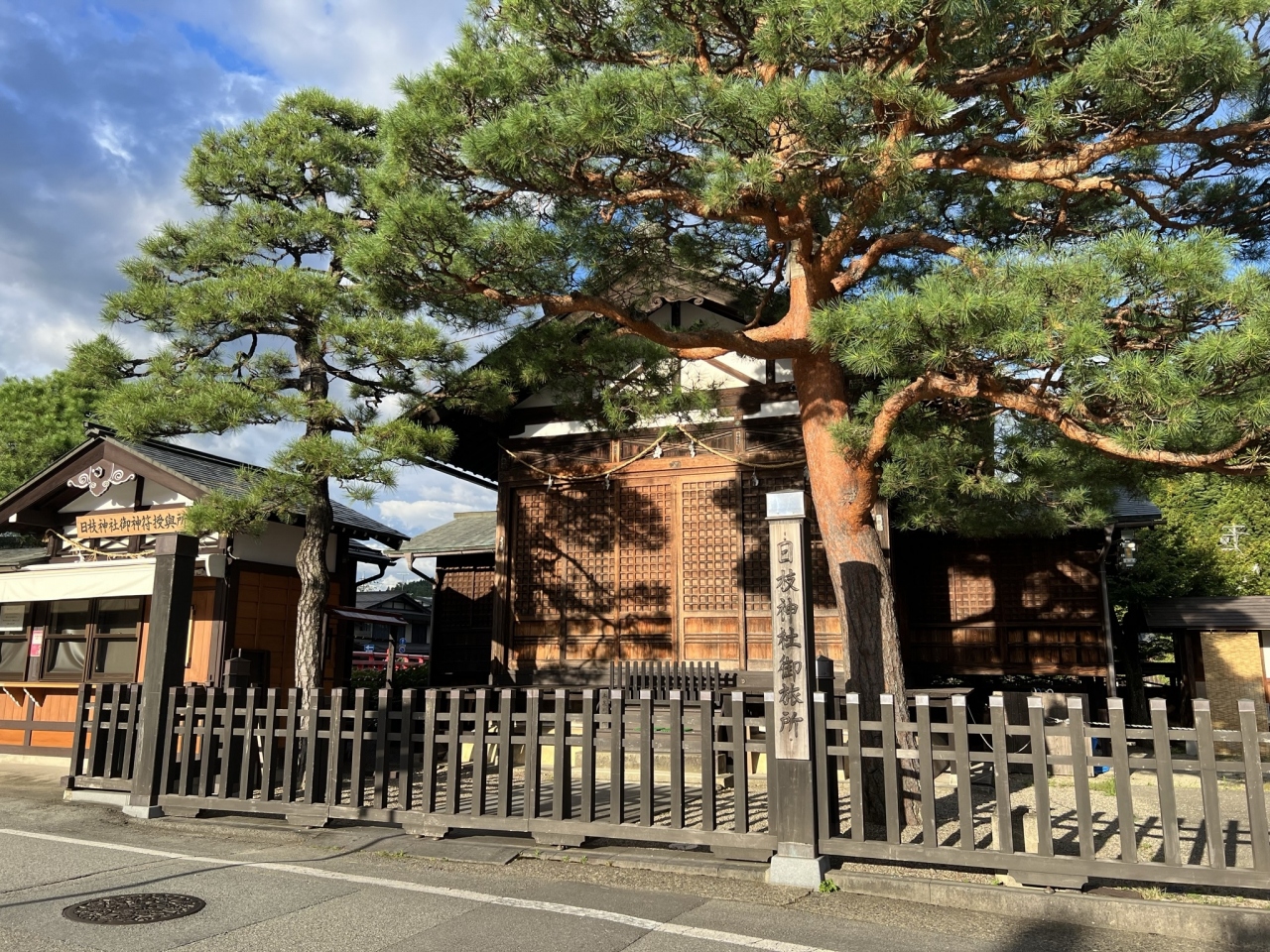 高山陣屋の目の前、中橋のたもとに「日枝神社御旅所」と書かれた札がかかった、厳かな雰囲気の木造の建物があります。日枝神社は春の高山まつりの氏神様(大山昨神)で、神社を出発したご神体は、この御旅所で一泊されます。