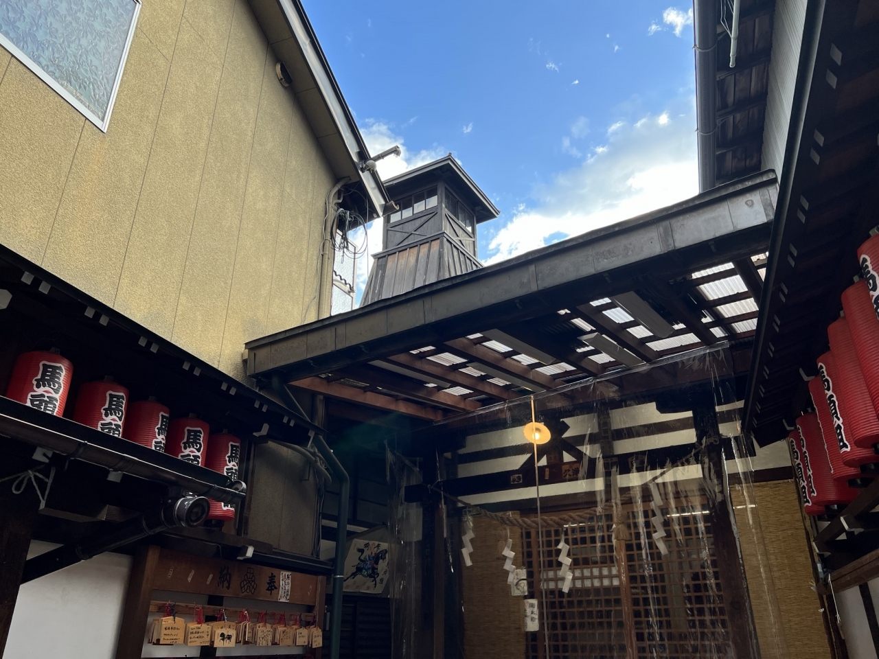 高山駅から歩いて10分、高山の商店街のひとつである本町通りにある神社です。本殿の奥にある火の見櫓は「景観重要建造物」として国の登録有形文化財に指定されており、神社の入口には「火消し 馬頭組 火の見櫓」と書かれた石碑があります。