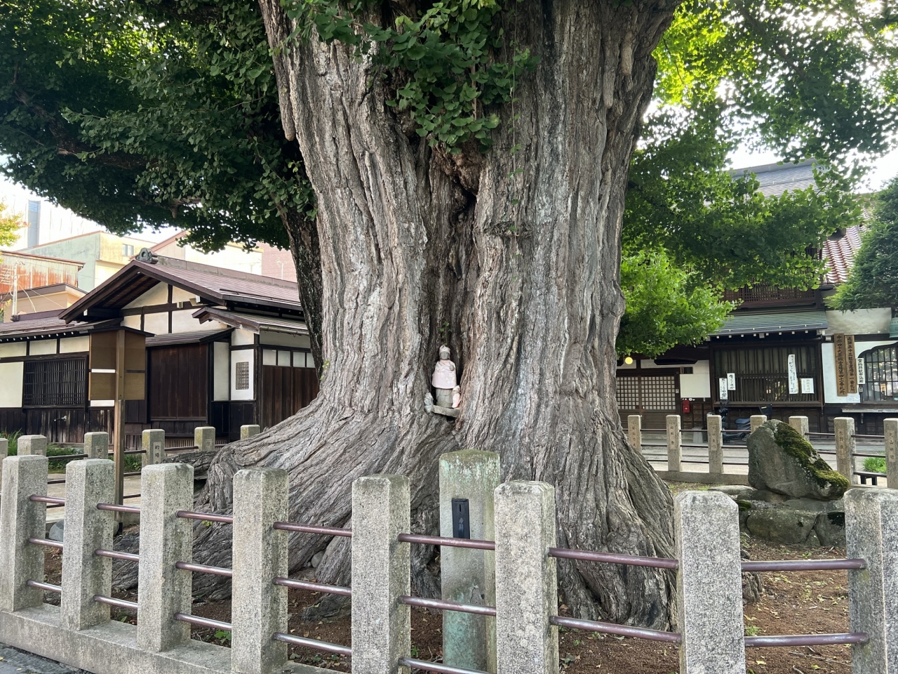 高山駅の東口から歩いて7,8分の所にある高野山真言宗の飛騨国分寺。その境内、本堂の横に高さ約40m、幹回り10mのイチョウの木があります。イチョウの幹の中には、大小のお地蔵様が安置されていて、厳かな空間になっています。