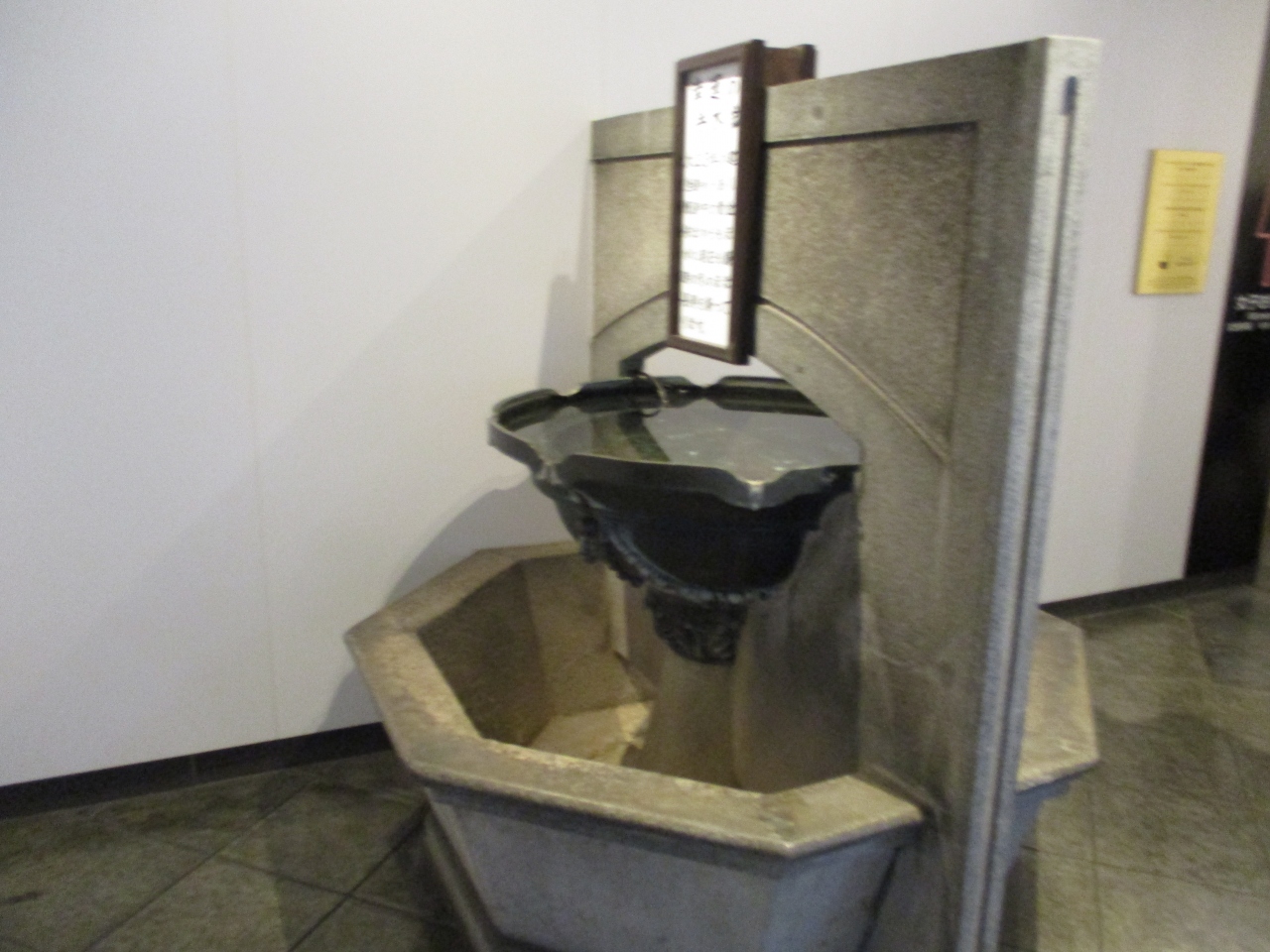 門司港駅のトイレを利用する際、見かけました。出入口の男女仕切り部分に設置されている青銅製の手洗い器でした。大正3年の建設当時からあるもので、戦時中の貴金属供出からもまぬがれて、現在も鋳造時の形のまま長寿を誇っていました。