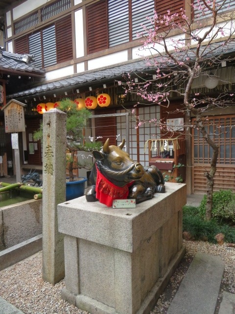 錦市場にあるということで、天満宮ですが、当然商売繁昌のお参りに来る方が多いのでしょう。たくさんの提灯が飾られていて、雰囲気ぐ華やかです。本堂にも金色が輝いていました。あと、ここの牛は、妙にリアルで可愛いです。