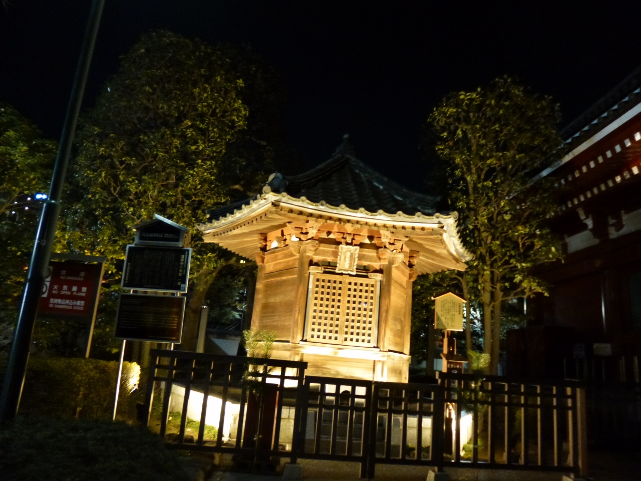 浅草寺境内、回向院の近くに六角堂があります。元は現在の場所より東へ22mほど行ったところに立っていたそうですが平成6年にこちらに動かしたそうです。浅草寺境内最古の建物といわれているので、移築なども大変だったのではと思います。屋根を支える垂木は、建物の中心から傘の骨のように放射状に広がっているそうです。夜訪れたのでライトアップされた姿もきれいでした。