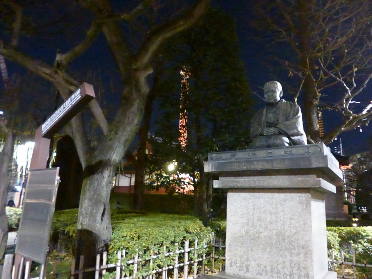 浅草寺境内、新奥山といわれる一角に高い台座の上に腰かけた女性の像があります。これが瓜生岩子氏の像です。瓜生岩子さんは福島の生まれ、戊辰戦争では敵味方関係なく手当てにあたり、死者を弔い、子供たちのための学校を作り、孤児や貧困者たちを保護する活動をしました。明治30年福島で亡くなりましたが、その行いに感銘した人たちにより明治34年にここに銅像が建立されたようです。やさしさの感じられる銅像です。
