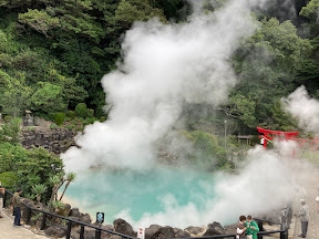 国指定名勝で、コバルトブルーが源泉が98℃もあるとは信じられない涼しげで綺麗な色でした。白龍稲荷大神や、赤い池の赤池地獄や、無料の足湯もありました。温室の水連や大鬼蓮も綺麗でした。売店の品ぞろえも豊富で、お土産も買いやすかったです。