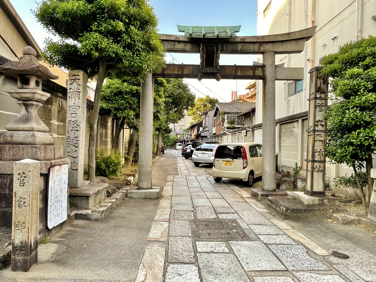 四条駅の近く住宅地の中にある菅原道真を祭神とする神社です。菅原道真邸や菅家廊下といわれた学問所の跡で、道真以前から菅原家の邸宅地だったそうです。現在の本殿は1869年に下鴨神社の旧殿を移築したもので、境内には本殿、幣殿ほか多くの社殿が建っています。