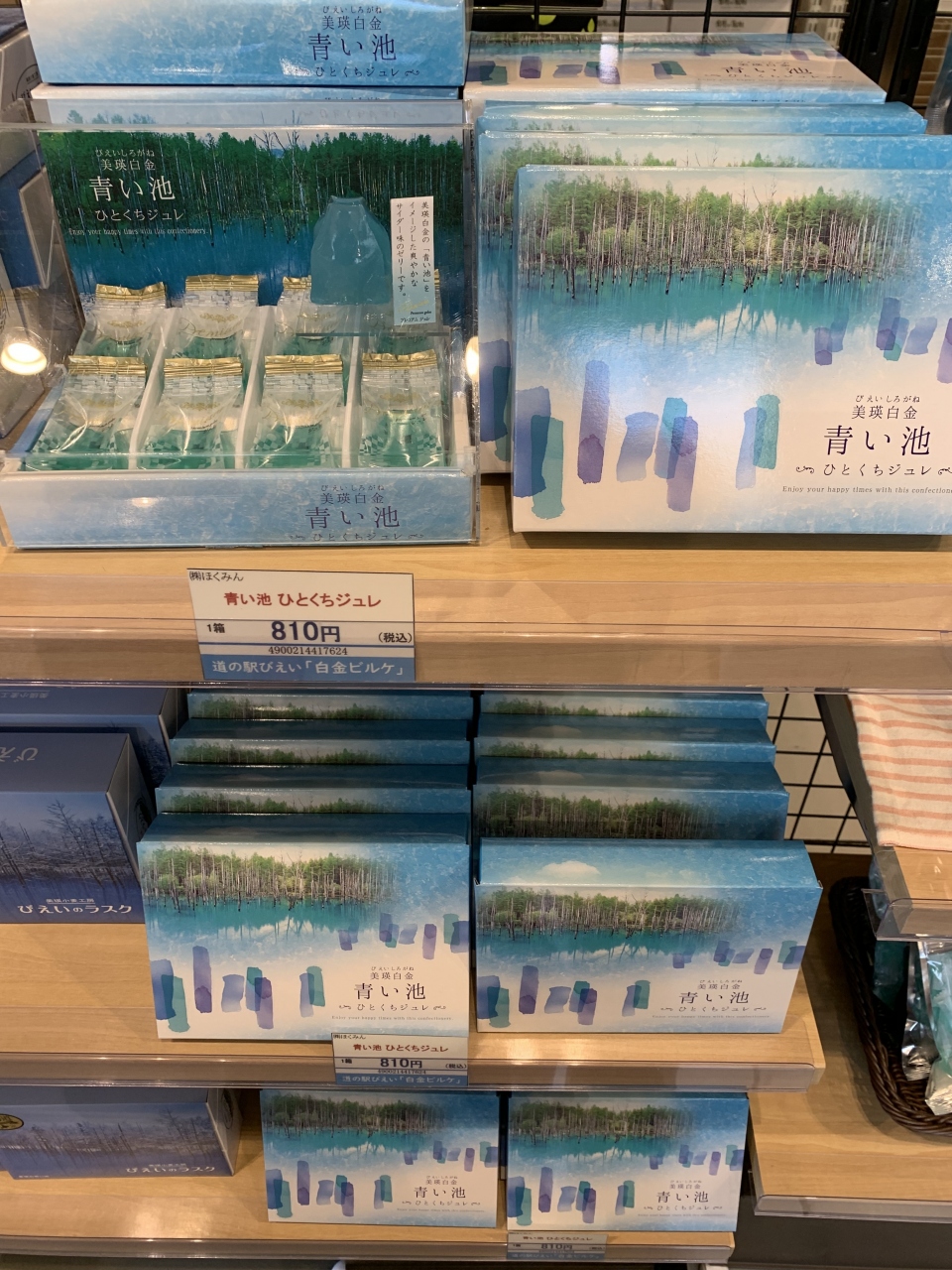 美瑛の青い池の近くにあるせいか、お土産ものは、青い池関連が多いですね。