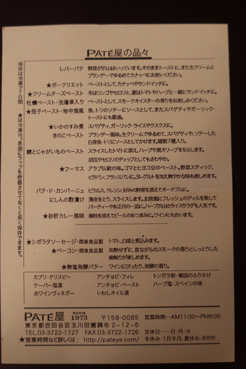 環八通りに近い玉川田園調布の高級住宅街の一角にあるパテの専門店です。緑の覆いしげる住宅の中にあり、初めて行くと看板を見逃しそうになります。小さな小屋の様な店舗には様々なパテがショーケースにずらり。今回は一番お薦めのレバーペーストを購入しました。