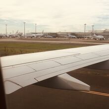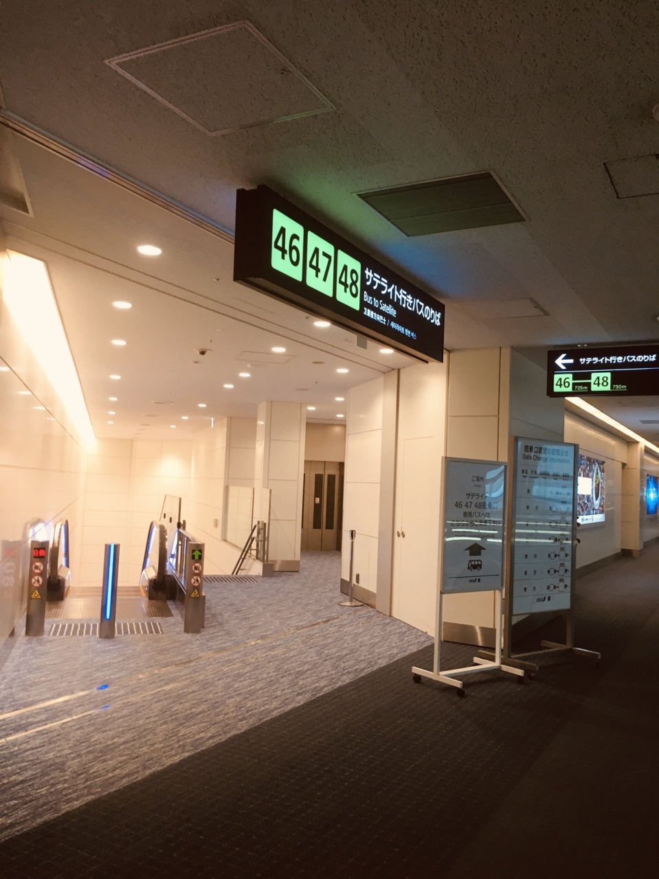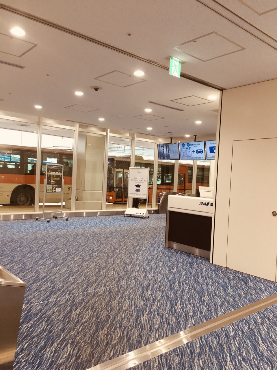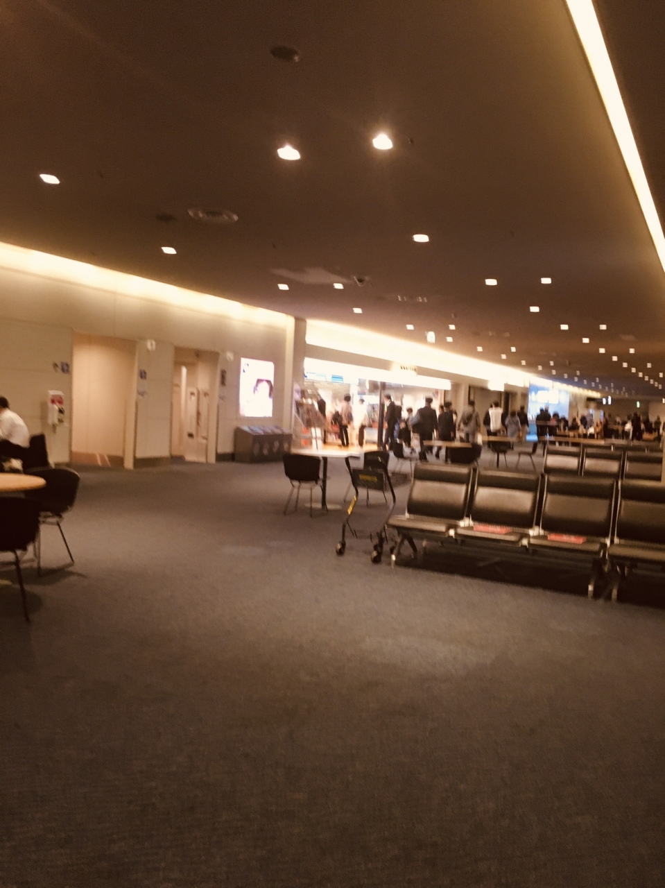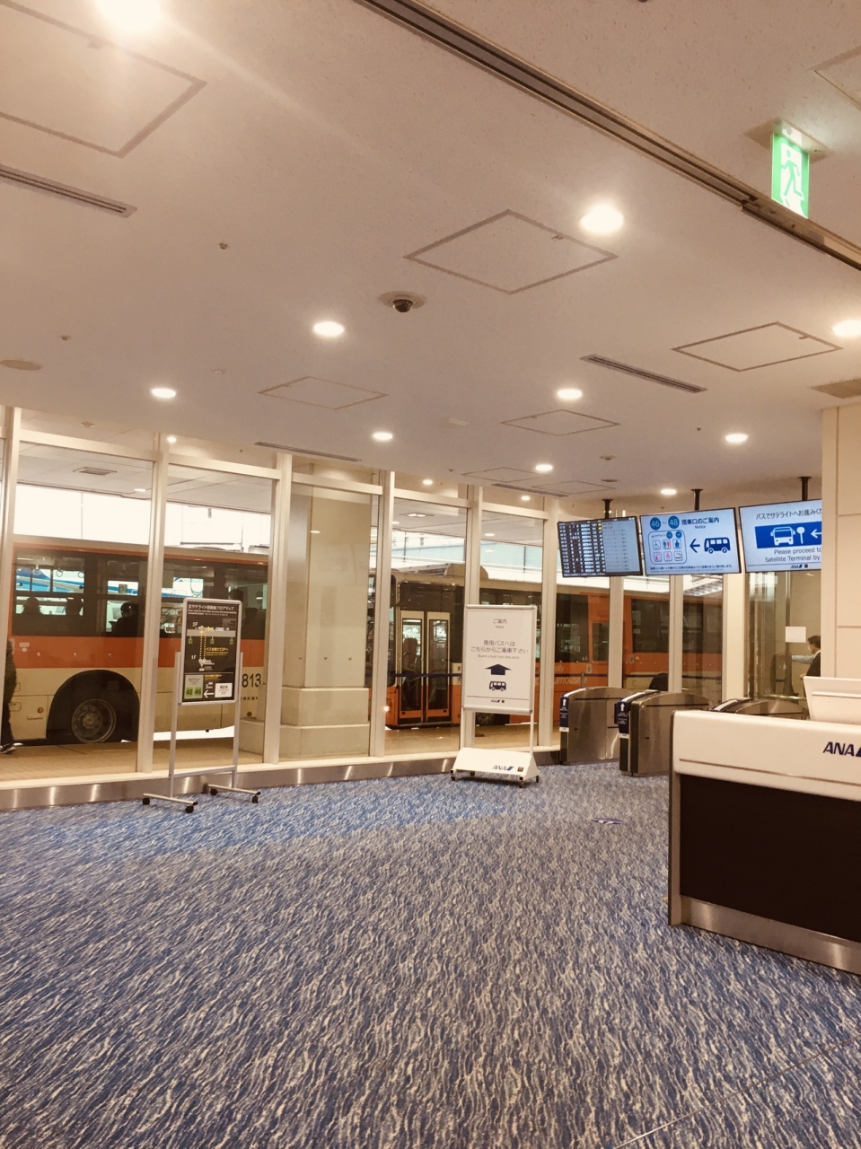 東京モノレール駅を降りて、サテライトバスラウンジまで行きました。通路を通り、右側には滑走路が見えたり隠れたりしながら10分ぐらいで着きました。ラウンジは広く座席数がたくさんあり、ANAフェスタの店舗が一つのみありました。