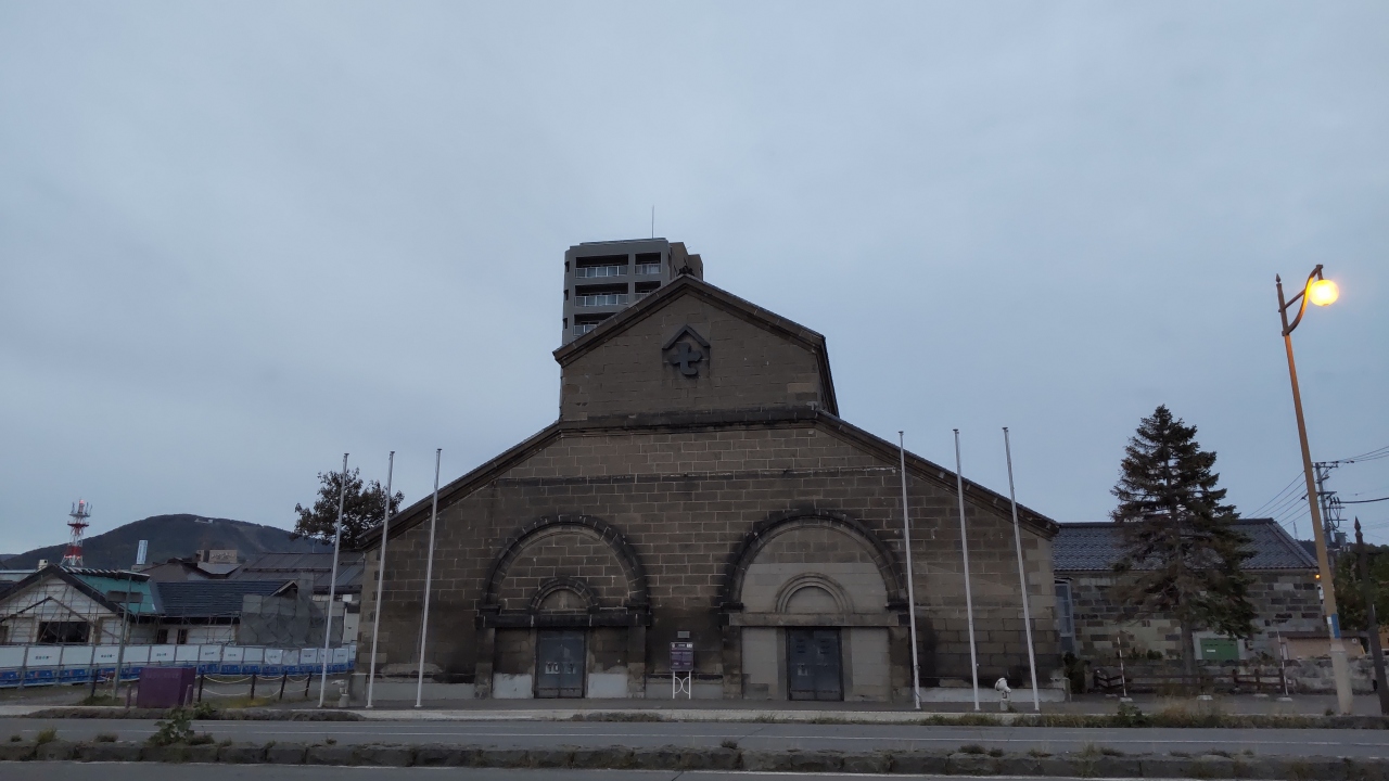 コンクリートブロック(中はレンガかも)の積み上げ壁面を持つ倉庫で、2段屋根になっているのが特徴的。また2連のダブルアーチ搬入口もインパクトあります。