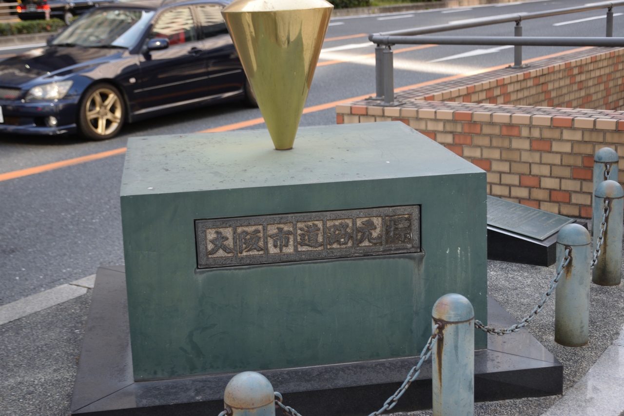 道路の原点となる道路元標。大阪市の道路元標は曾根崎の交差点にあります。小さな元標の看板が足下に設置されています。交差点の街路樹が植えてある場所にある為、少々わかりにくいかもしれません。大阪駅前ビルの目の前にあります。