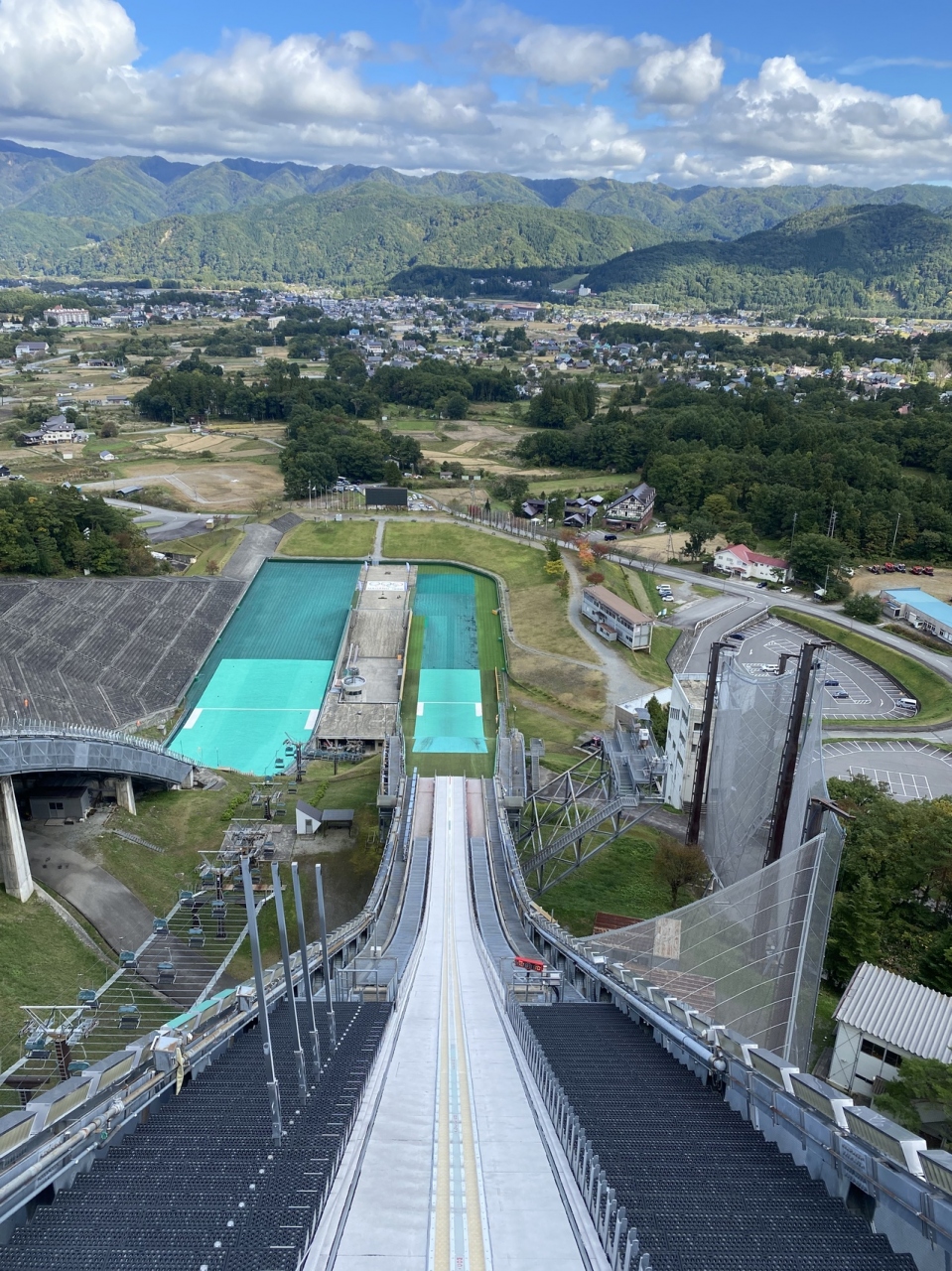 長野オリンピックのレガシーの象徴ともいえる場所ということで訪問。駐車場は無料。500円程度払ってリフトに乗り、ジャンプ台と同じ高さの展望台に行きます。そこまでの階段は下が見えて高さが直で感じられます。足がすくんでジャンプってすごいなと改めて感じました。