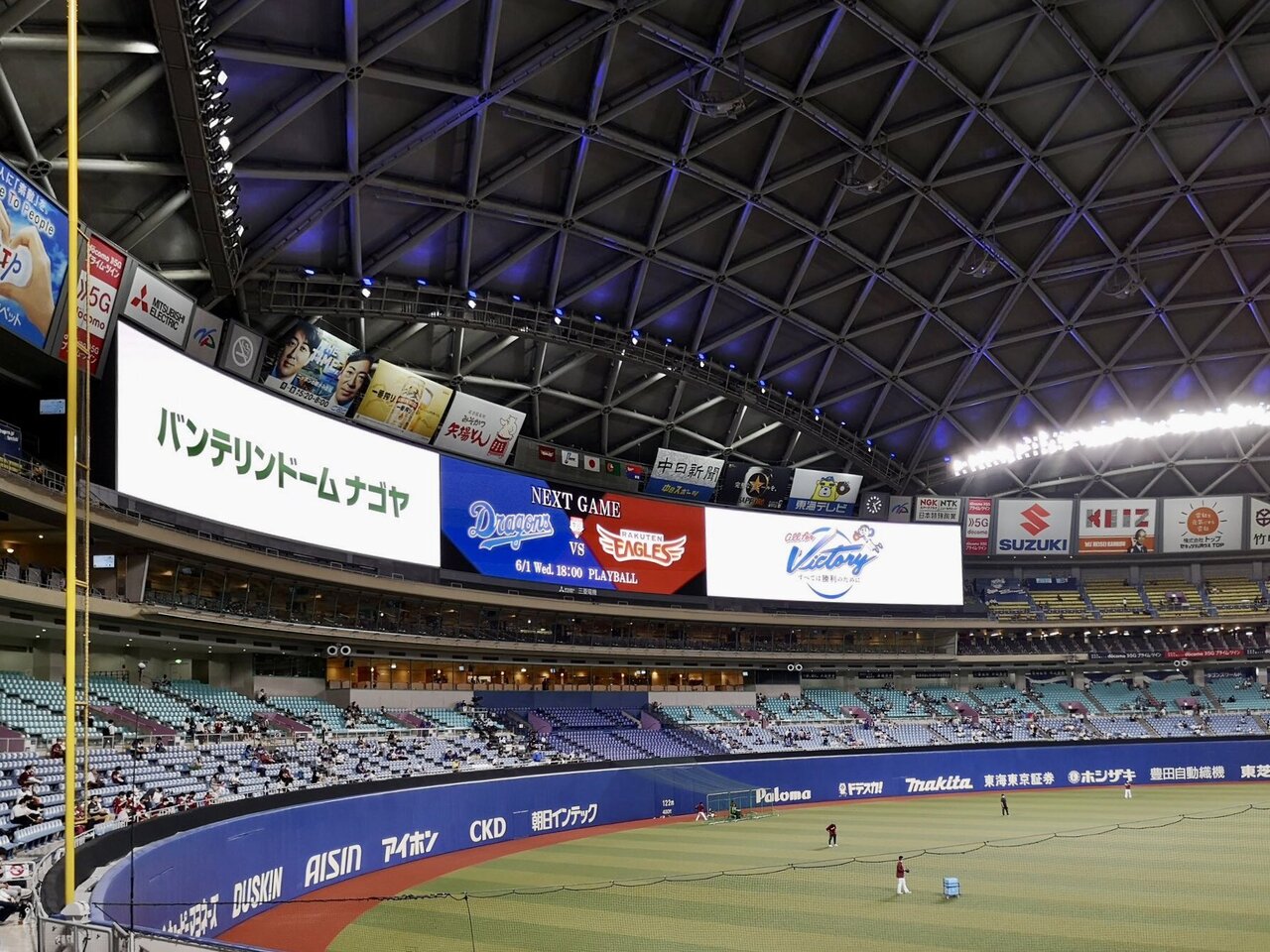 バンテリンナゴヤドームにらセ・パ交流戦の試合観戦に行ってきました。ドーム球場は全国5つありますが、ここで4つ目です。パノラマ席は前後の傾斜があり、前方の視界が良く、観戦しやすいです。上階からでもグランドとの距離感は気になりません。ビール1杯売店で買うと750円、スタンドで売り子さんから買うと700円です。