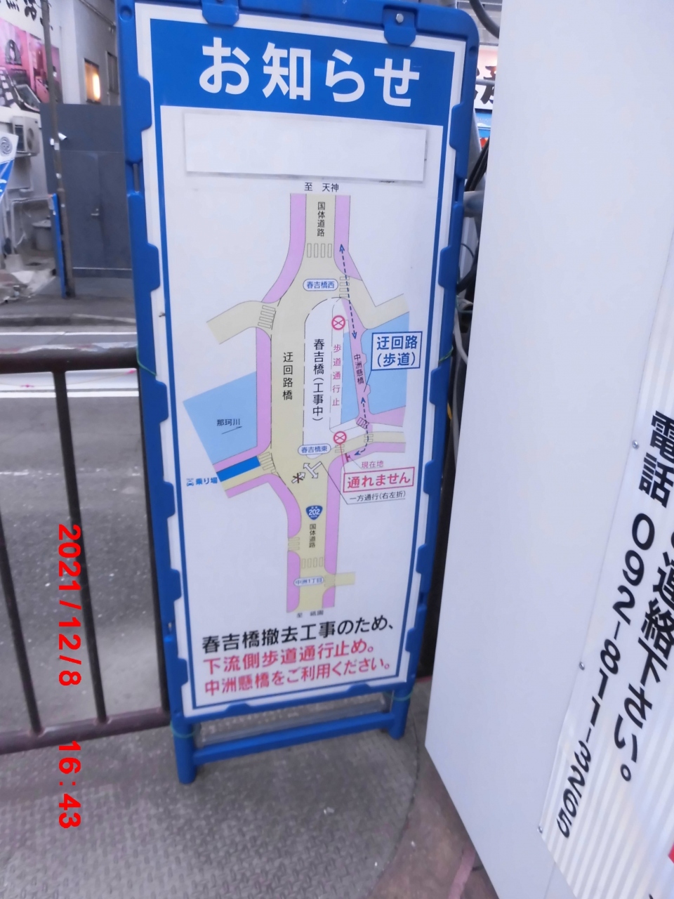 福岡市博多区観光で立ち寄りました。春吉橋は、一部工事中の為、中洲懸橋側の歩道は通行止めで、反対側のほどを利用して橋を渡りました。迂回路の歩道として中洲懸橋が、案内されてました。橋の上は、片側2車線の広い国体道路が走ってます。