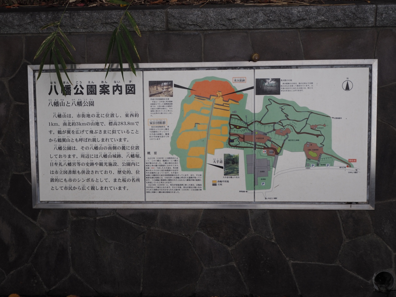 日牟禮八幡宮やロープウェイ乗り場の前の道を歩いて行き、途中横道に入り階段を上っていくと八幡公園があります。八幡山の斜面の中腹に造られた公園です。公園のなかを歩いて行くと八幡城にゆかりの豊臣秀次の銅像もありました。かなり立派な銅像です。本来ならば八幡城跡があった山頂の方がよかった気はします。公園からは街も眺められました。