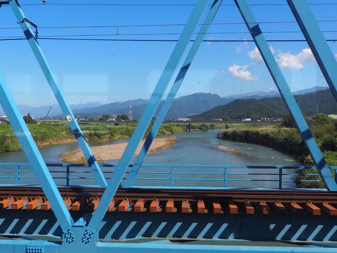 しなの鉄道線は小諸のあたりから千曲川の流域に寄り添うようにはしりますが、車窓に川が見える区間はあまりなく、篠ノ井駅手前の千曲川橋梁でその雄大な姿を眺めることができました。