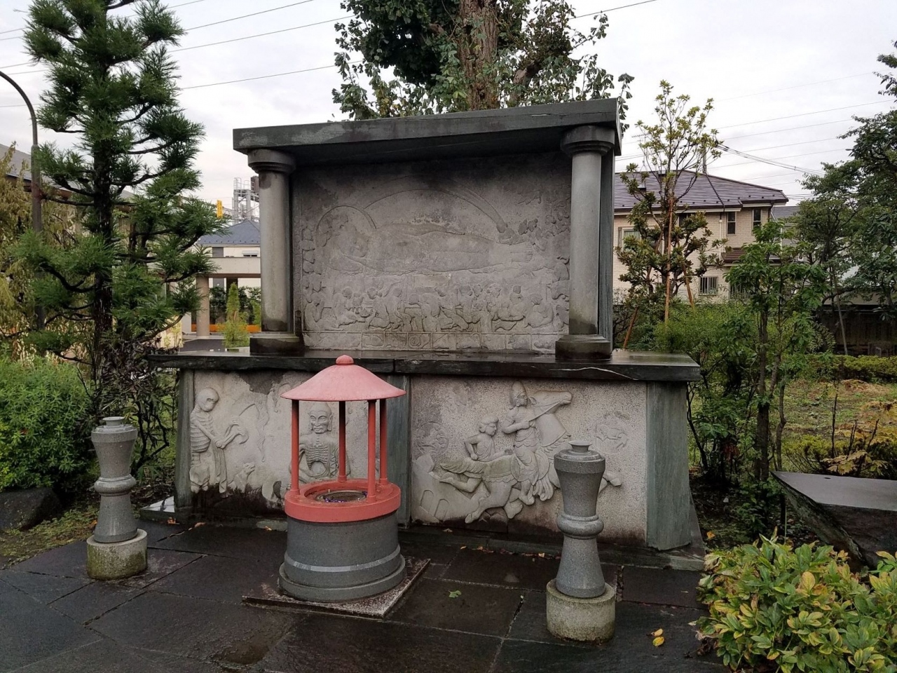 乗満寺の次に訪れました。境内に入って本堂までの長い石畳を歩いていると右手に石造りのレリーフがありました。浮き彫りがやや浅いので遠目には分かりづらいですがお釈迦様が横たわっている涅槃図ですね。この構図はただ横になって休んでんのかなと思ったらお釈迦様が入滅なさったことを表しているということをここに来て今更知りました。