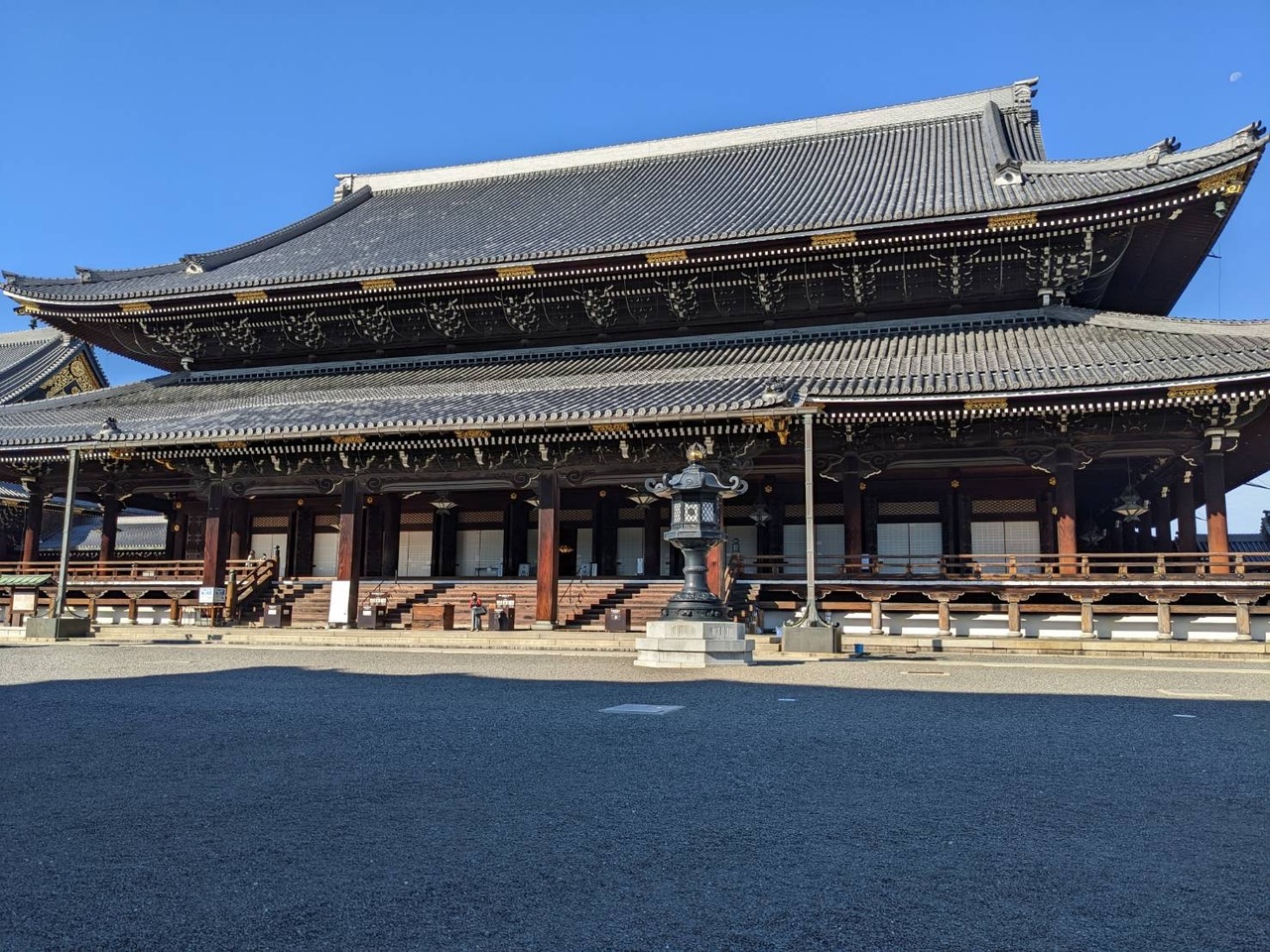 JR京都駅 (中央口)から歩いて5分位のところに「東本願寺」はありました。 京都駅から近いので朝の散策途中に立ち寄ってみるのも良いです。広い境内には「御影堂」と「阿弥陀堂」が並んで建っていましたが、いずれも大きく荘厳なお堂で圧倒されました。