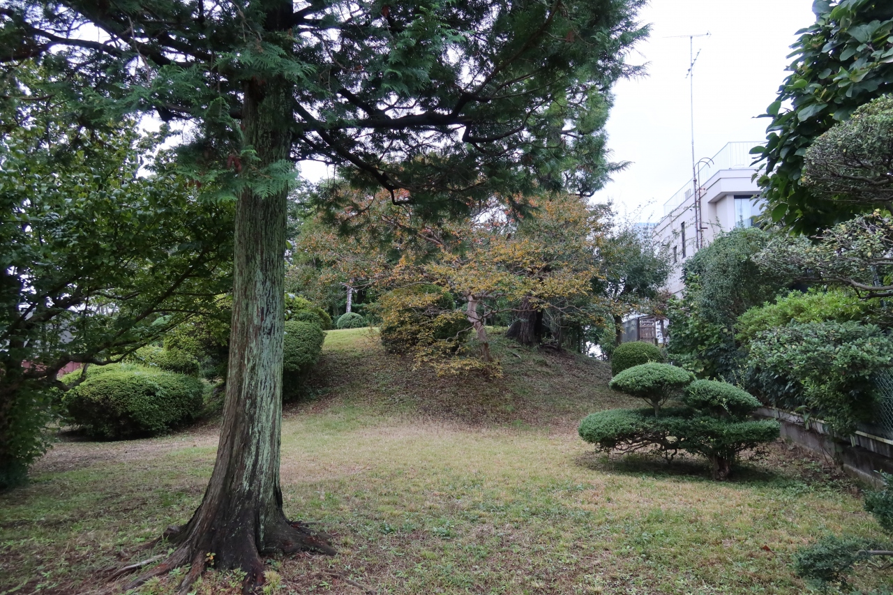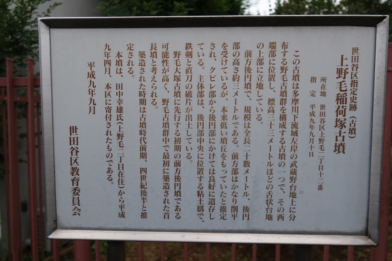 上野毛駅から環八を渡り、カトリック東京大司教区上野毛教会の前通り南に進むと住宅街の右手に遊歩道があり、その奥に上野毛稲荷塚古墳があります。