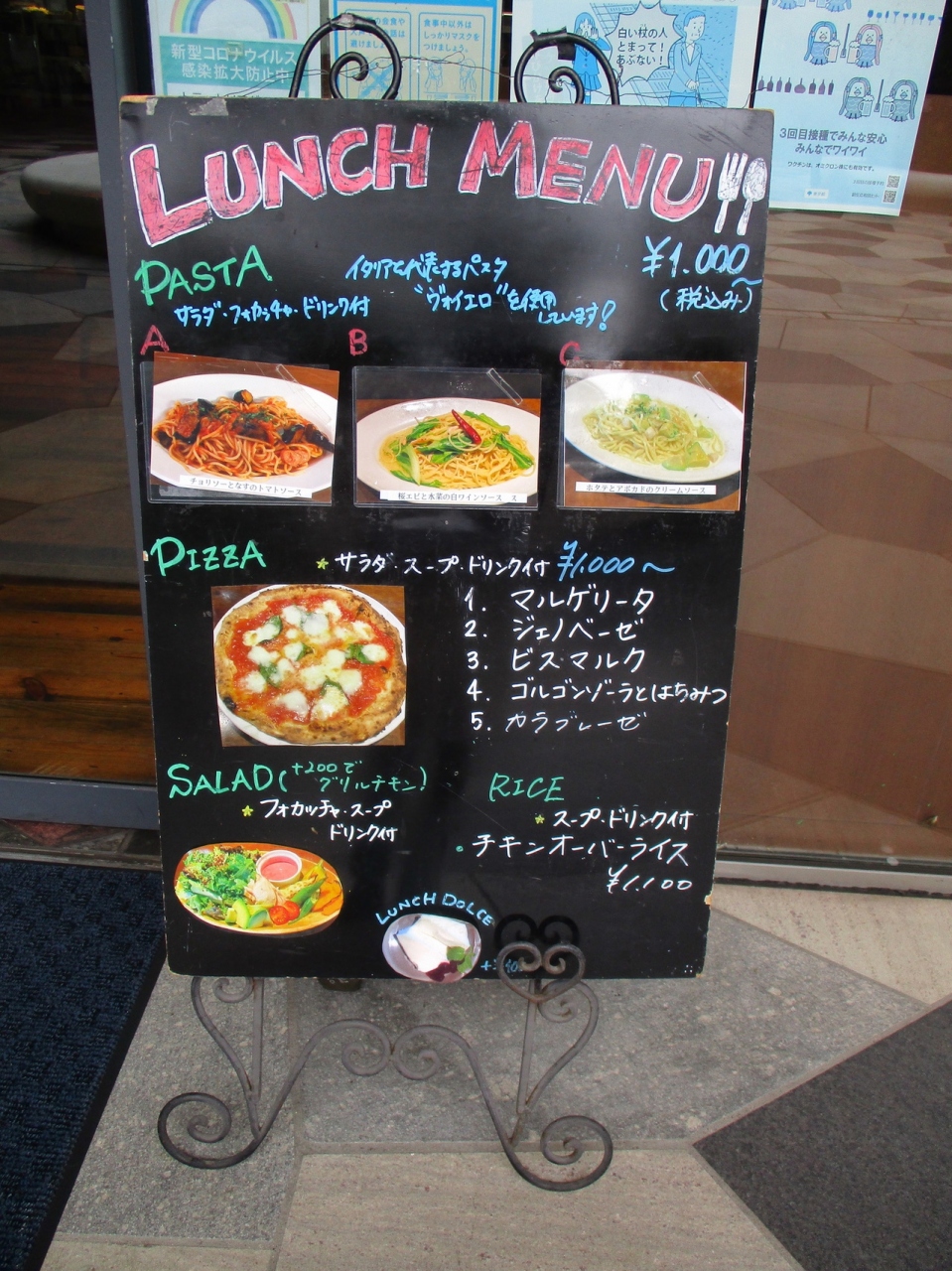 東新宿のイーストサイドスクエアの飲食店街の一角にありました。新宿三丁目などからも少し離れていて、都会の喧騒を感じず、ゆったりとランチがいただけます。パスタやピザがサラダ、ドリンクなどがついて1,000円とお得でした。