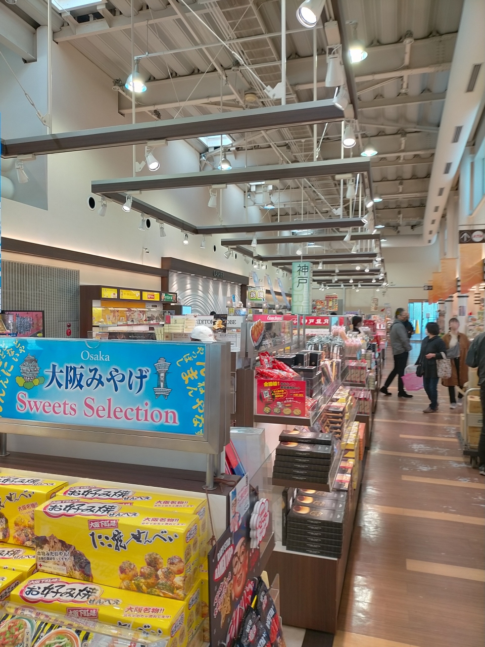 安心してください! 下りとあって、買い忘れた大阪のお土産も買えるようになっています。品数十分、神戸のお土産、淡路島のお土産、このエリアのモノはだいたい揃っています。おっきいSAなので、人が多いときには、落ち着いて選べないので買い忘れた時に来るのがよいかと。