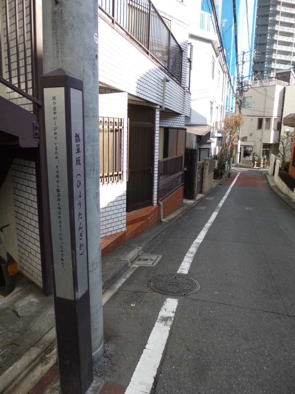 神楽坂駅から2分ほどのところに白銀公園があります。その東南端から東南方向に下っていくのが瓢箪坂です。名前の由来はわかりやすく、坂の中ほどがくびれていて坂道全体が瓢箪の形のようになっているからだそうです。江戸時代からある坂といわれいているそうですが、現在それを忍ばせる碑などはありません。