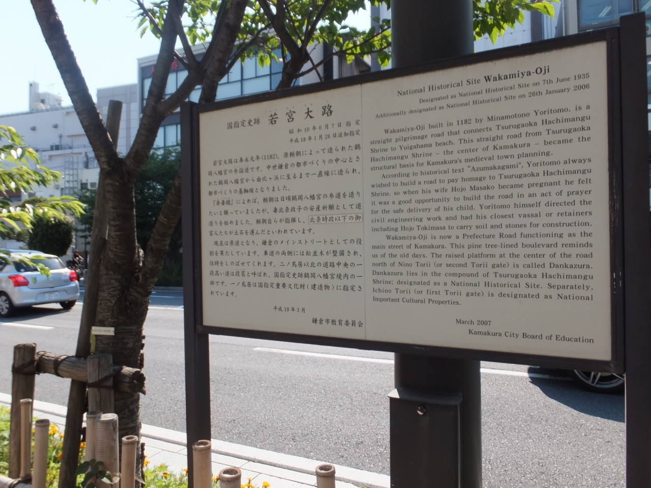 鎌倉にある大きな通りです。道を行くと鶴岡八幡宮へ、途中だんかづらもあり、鳥居やお寺などもある鎌倉らしい通りです。とはいえ、交通量も多く人も車も往来が激しいです。お店も多く観光にも便利。途中に案内板があったのでじっくり読んでみました。