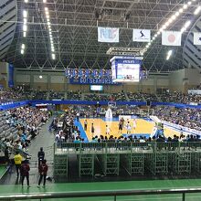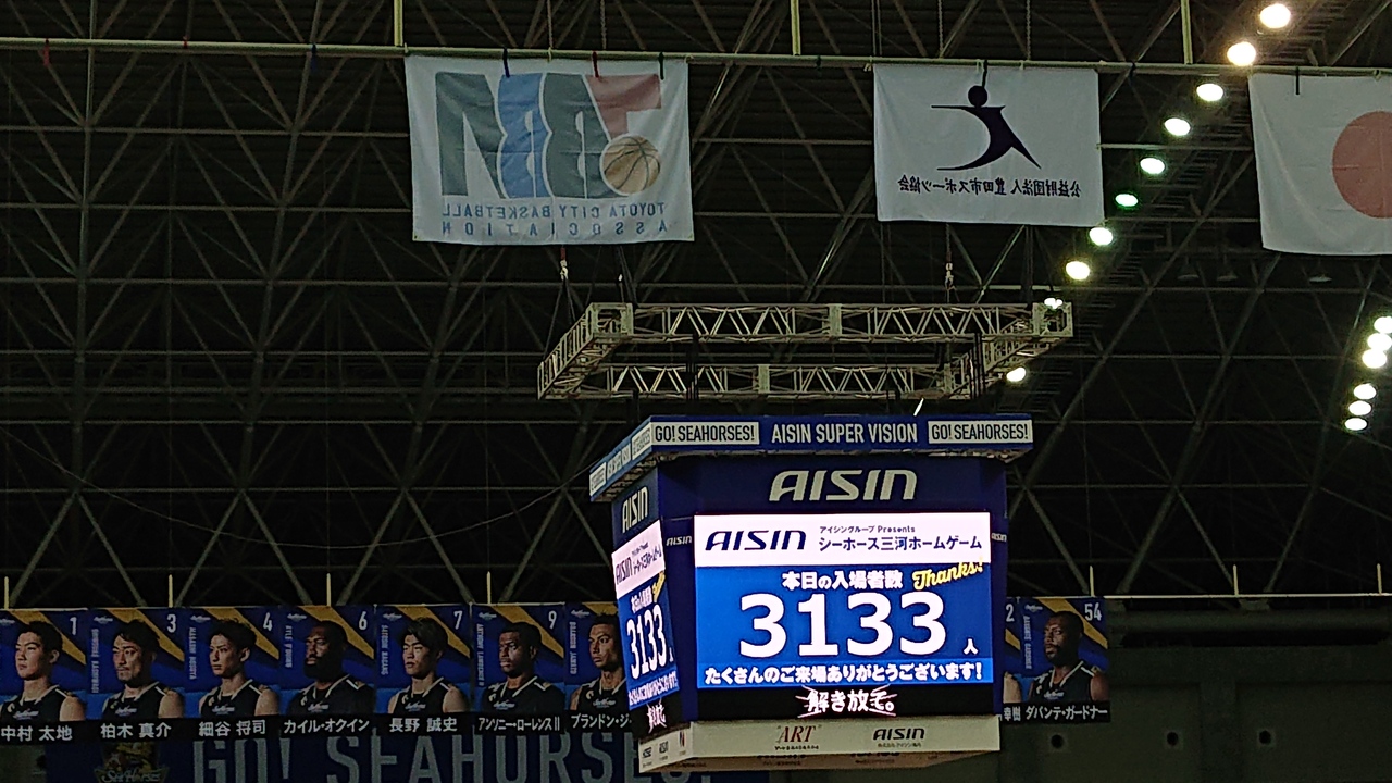 10月中旬の休日午後の時間帯に訪問し、Bリーグ「三河対京都」を観戦しました。席種は、2Fエンド指定席A (Aはアウェイ寄りの席の意味)。座席位置は、中央よりややベンチ寄りでした。こちらの会場で、エンド側からバスケを観戦したことは無かったので、行く前はやや不安でした。しかし、実際にはまずまずの見え方で、納得でした。なお、試合は、元三河所属の外国籍選手が大活躍した京都が、76対63で勝利しました。