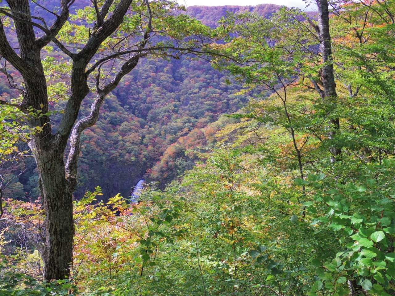 相変わらず、展望台周りの草は刈られておらず、木が生い茂り、もう、ほぼほぼ滝が見えていなく、見通しが悪いです。 紅葉は色づき初めですが、見えるのは隙間に少し。