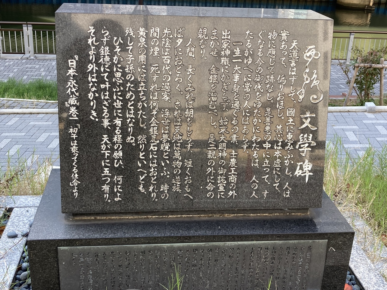 井原西鶴は大阪出身なのだそうで、この石碑には著作である日本永代蔵の一節がびっしりと書かれています。