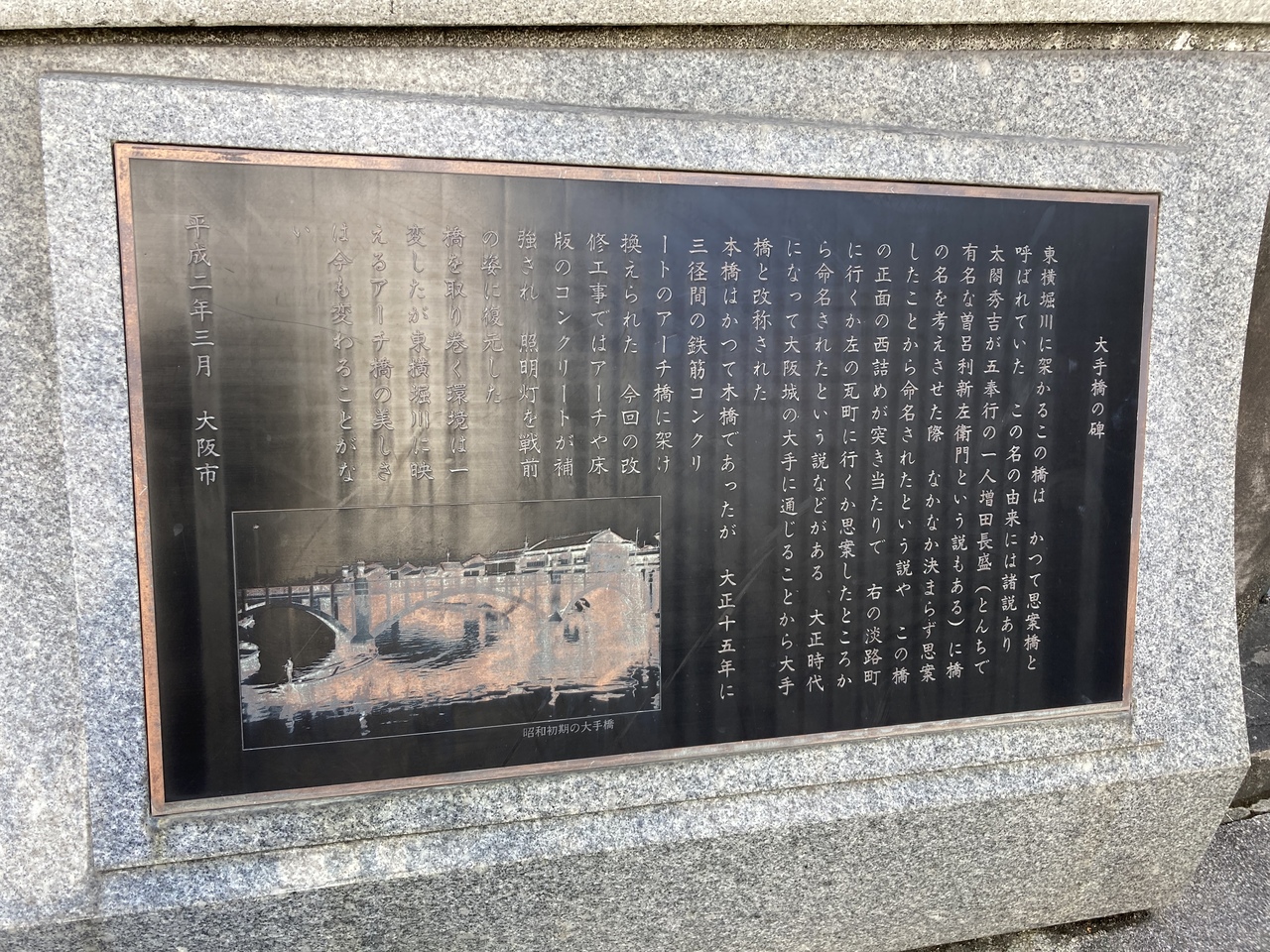 大手通は大阪城へと続いていく歴史ある通りで、この橋にも歴史がありますが、案内板によれば意外にも昔は思案橋という不思議な名前がついており、その理由もいくつか説がありはっきりとはわかっていないのだそうです。