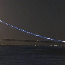 本州の舞子と淡路島をつなぐ、世界一長い吊り橋です。今回は、小豆島から神戸へのジャンボフェリーから見ました。夜には、青白くライトアップされます。高さも相当あるようで、フェリーから見上げる迫力に驚きました。