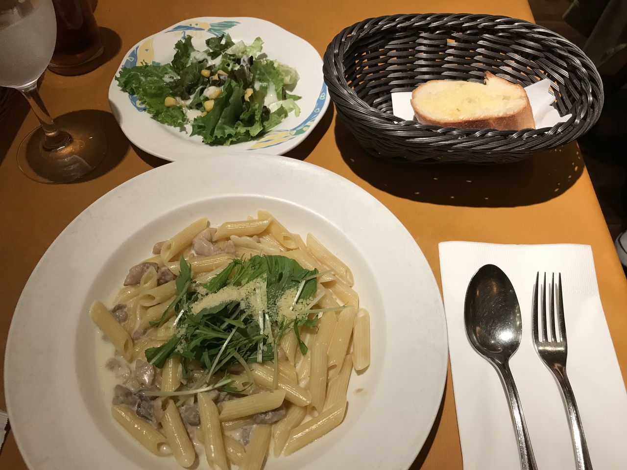このエリアで食事をするのは難しいなと思っていましたが、地下にあるイタリアンを発見しました。ランチのパスタやピザは日替りです。週末のランチ終了間際にEセットのショットパスタを注文。わりと早く食事を提供してくれました。