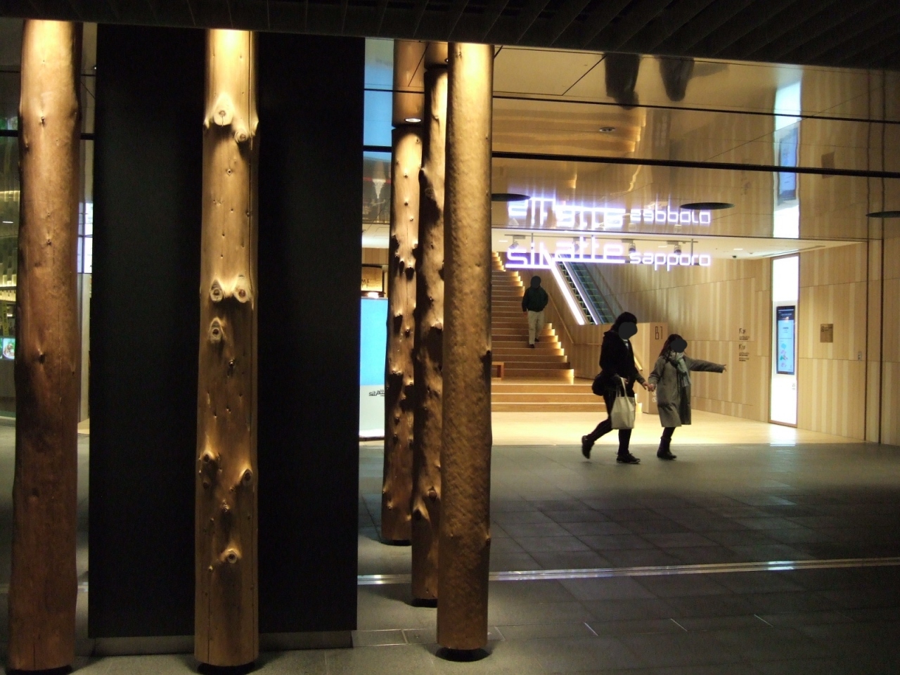 入口には丸太の柱が建ち並び、地上へ上がる階段も木を使っていて、温かみのある内装です。雪の日でも地下から入れるのは便利でした。