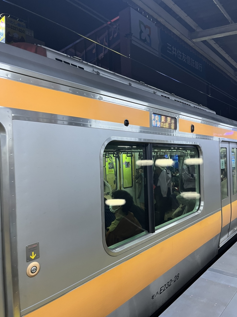走って ギリギリ 乗ったのは 最後尾の車両でしたが、混んでいました。