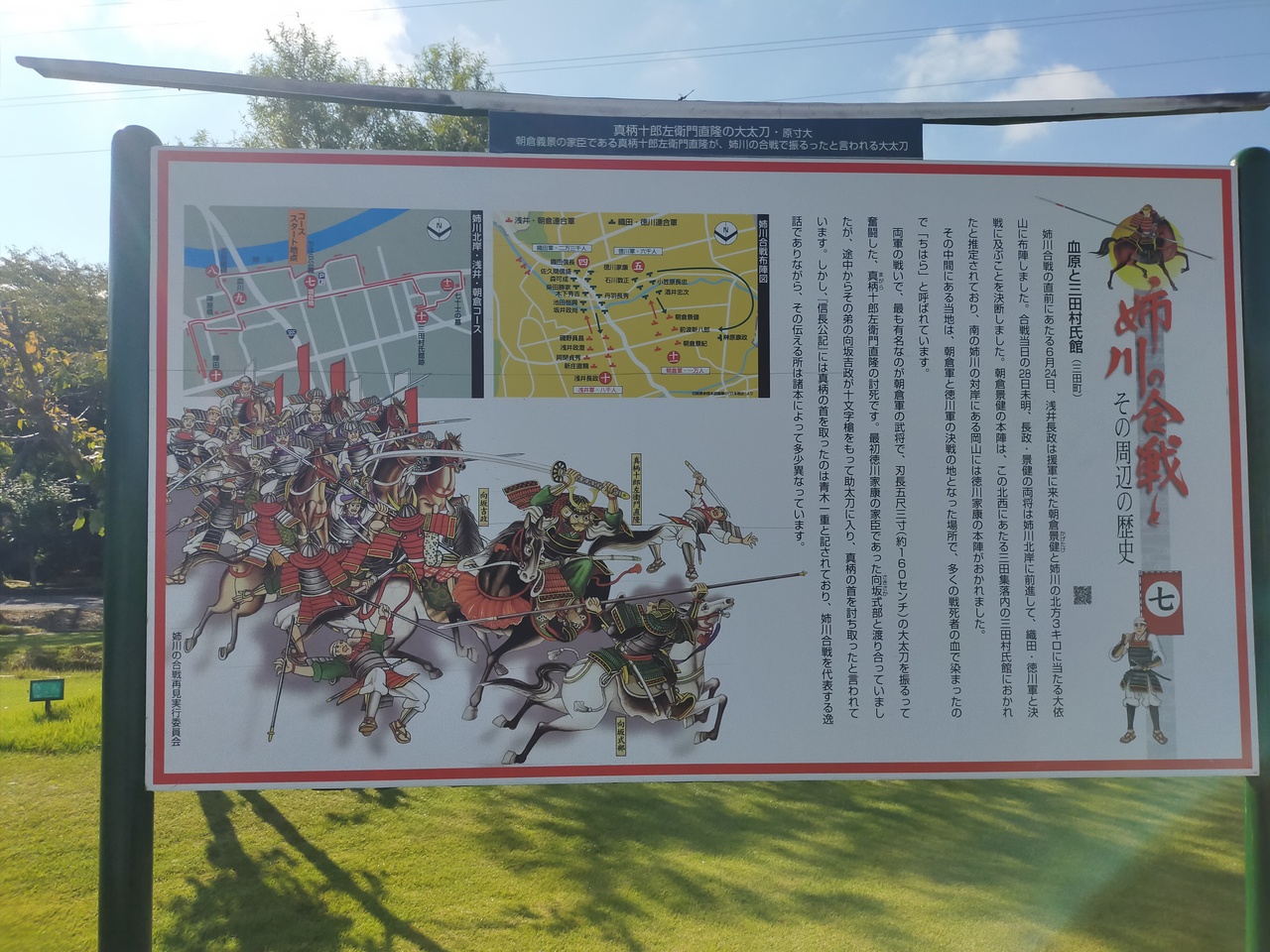 姉川の戦いの舞台はいつか訪ねたいと思っていましたが、そこまで感動するものはなかったです。実際ここで戦いが行われた、という形跡もなかったですし、案内板が少したっているだけでした。姉川の戦いといっとも広範囲で行われたようで、近辺一帯、では感情移入しづらかったです。それでも、彼岸花が綺麗な季節だったので、それは綺麗でした。