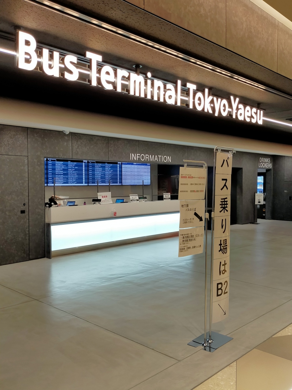 八重洲の歩道等に散らばっていたのりばが集約されて便利になりました。東京駅からも地下街を通ると傘が入らないので便利です。八重洲地下街を右折南方面です。チケット売り場が地下一階、バスのりばが地下二階です。