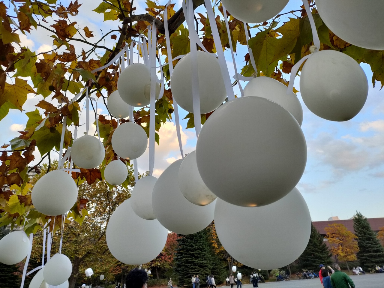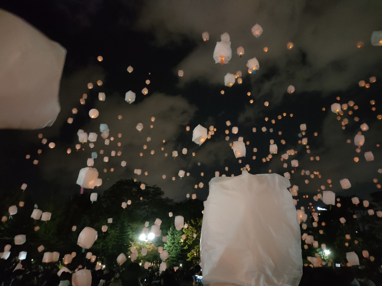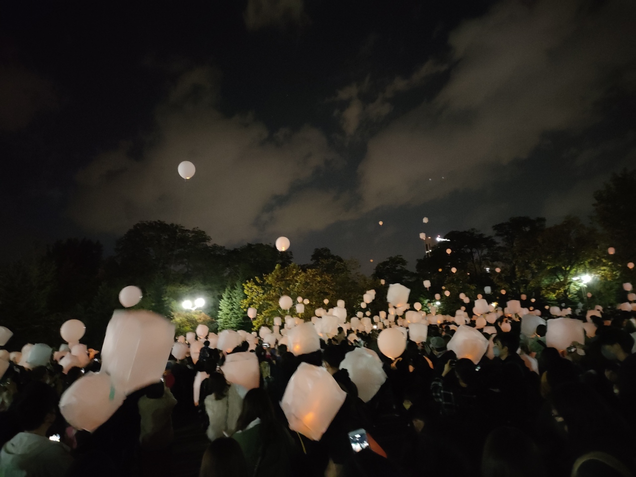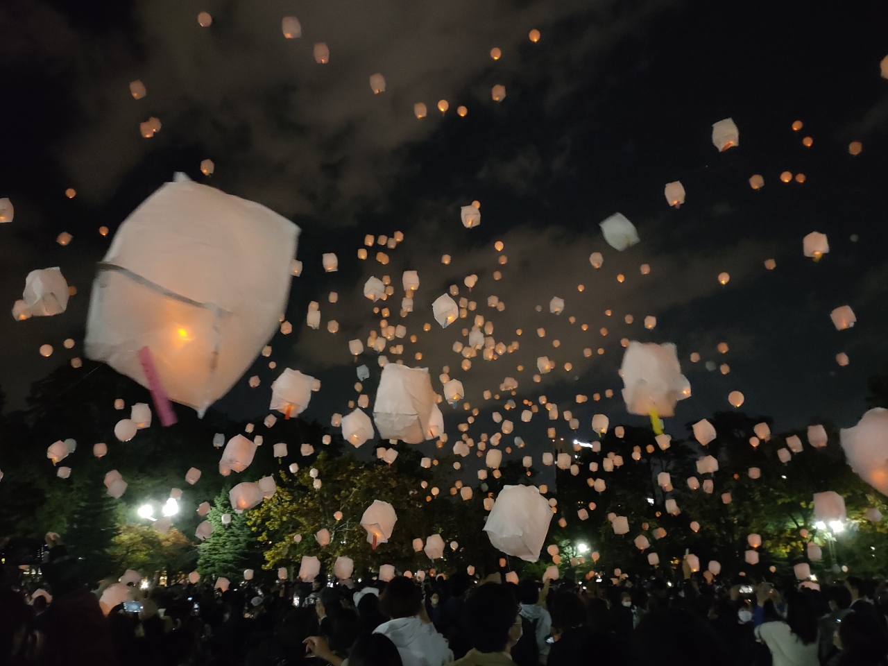 なお、自分でランタンを打ち上げなくても十分に楽しめるイベントで、場所を移して、中島公園の大分中程の”自由広場”で17時30分過ぎから打ち上げを見て楽しみました。ランタンは放任で上空へどんどん揚がっていってしまうものではなく、お祭りのヘリウム風船のように紐をつかんで繋ぎとめておくもので、一瞬でかなたへ飛んで消え去ってしまわずに、しばらくの間、空中に浮遊するランタンの風景が鑑賞できます。打ち上げは20分間ほど楽しめ、その間、空を見上げて幻想的な風景に見入ったり、写真を撮ったりして、皆、楽しんでいるようでした。ただし、中にはヘリウムが少なくて上手く揚がらないランタンや、隣のランタンと紐が絡まってしまうもの、また、途中、破裂音も聞こえていたので、潰れてしまったランタンもあったのかもしれません。