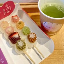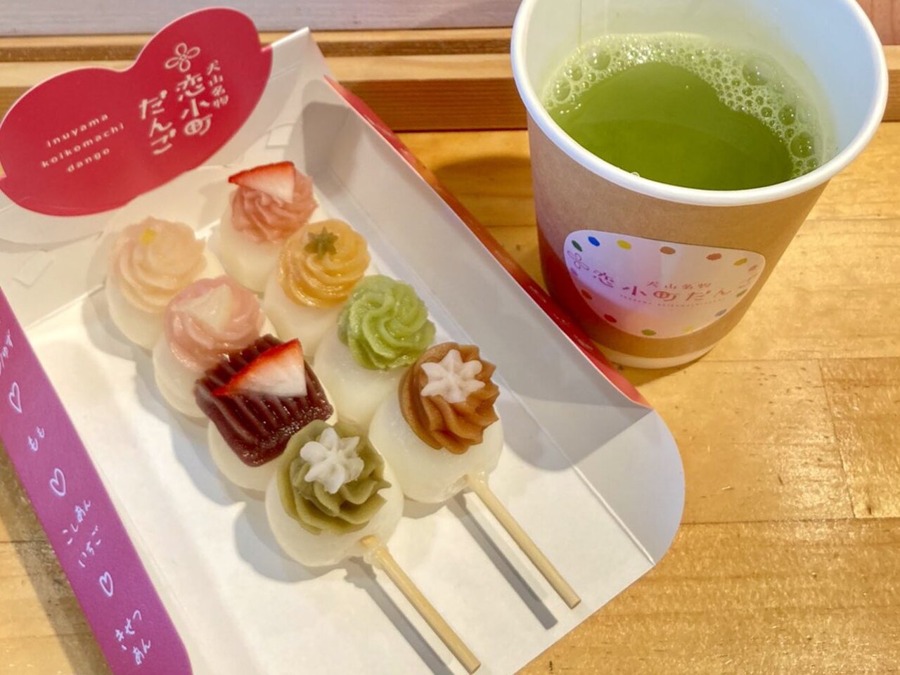犬山駅で降りて、犬山城を目指して歩くこと10分。犬山城下町に入りました。ここからまっすぐ歩いて犬山城に着きます。たくさんの土産店や飲食店が並んで活気があります。途中から犬山城も見えてきます。帰りに、3年前にも買った、名物の、恋小町だんごを食べて一服し、一箱を妻へのお土産にしました。