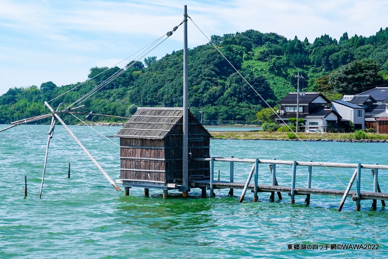 東郷湖は、はわい温泉や東郷温泉の中央に位置する周囲10㎞ほどの汽水湖です。倉吉から城崎温泉への移動途中に湖の東岸を通り、エビ・ワカサギ・シラウオなどを獲る「四ツ手網」小屋が設置されている湖岸から湖を一望した程度でした。