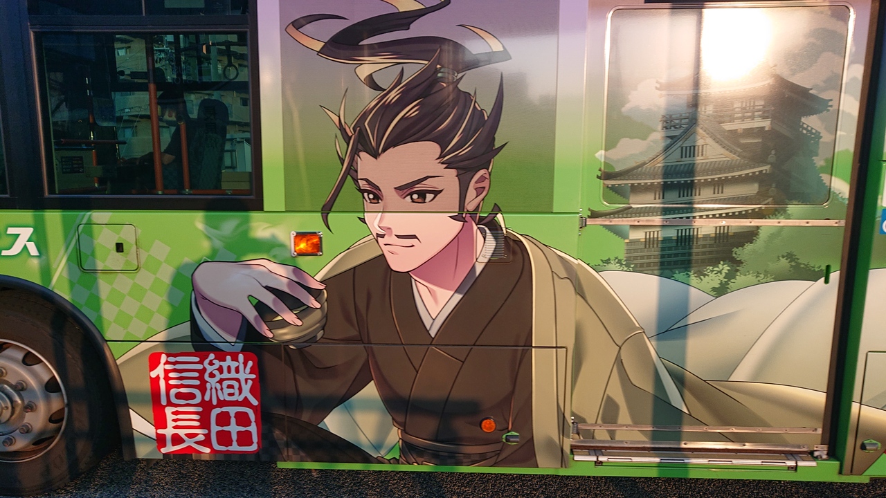 10月下旬の休日の午後4時台に、柳ヶ瀬バス停から鵜飼屋バス停までの区間で、市内ループ線に乗車しました。その際に乗車したバス車両が、「信長バス」でした。車体に大きく、織田信長のアニメキャラクターが描かれており、楽しいバスだな、と感じました。