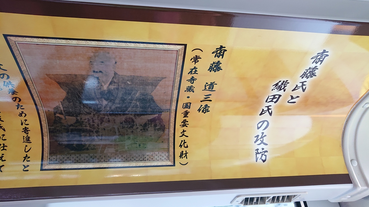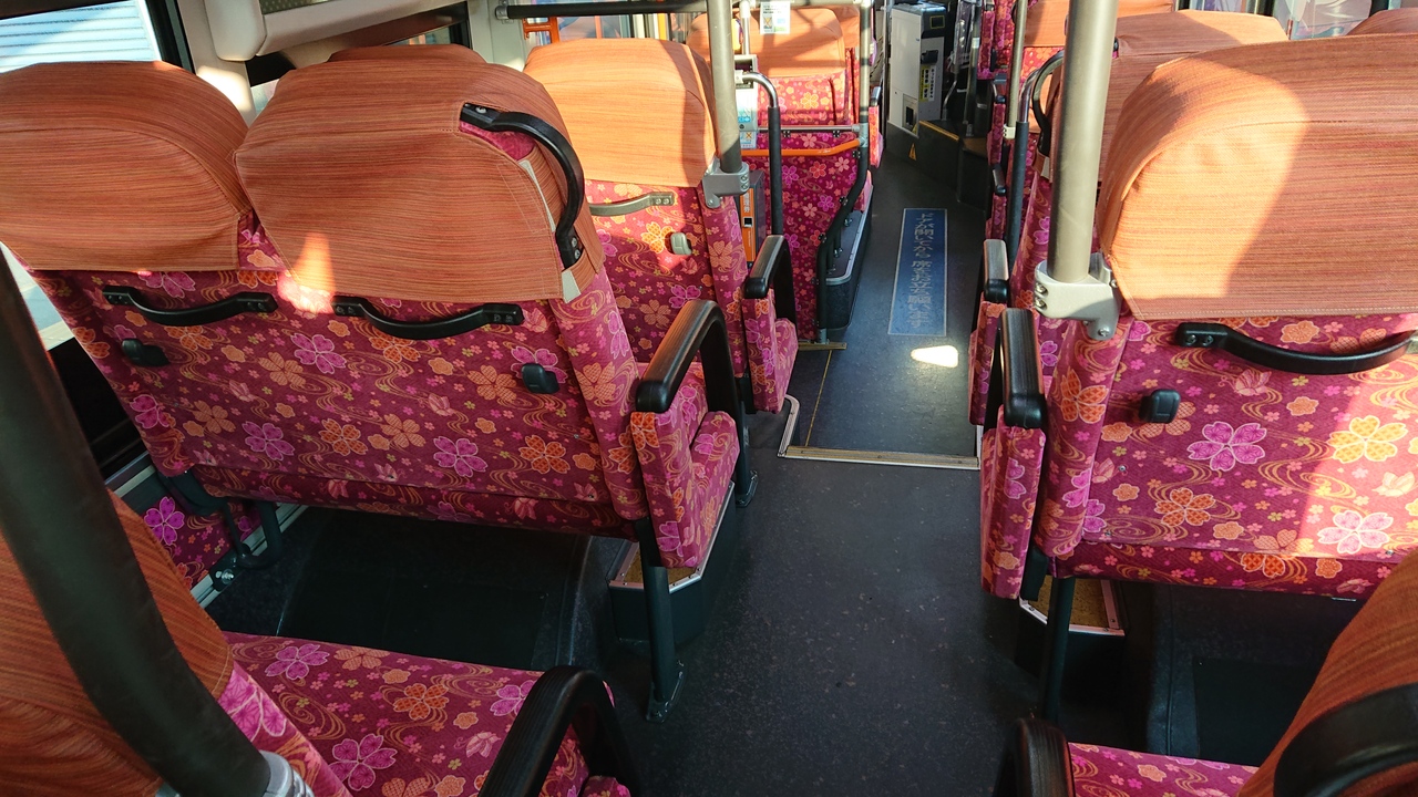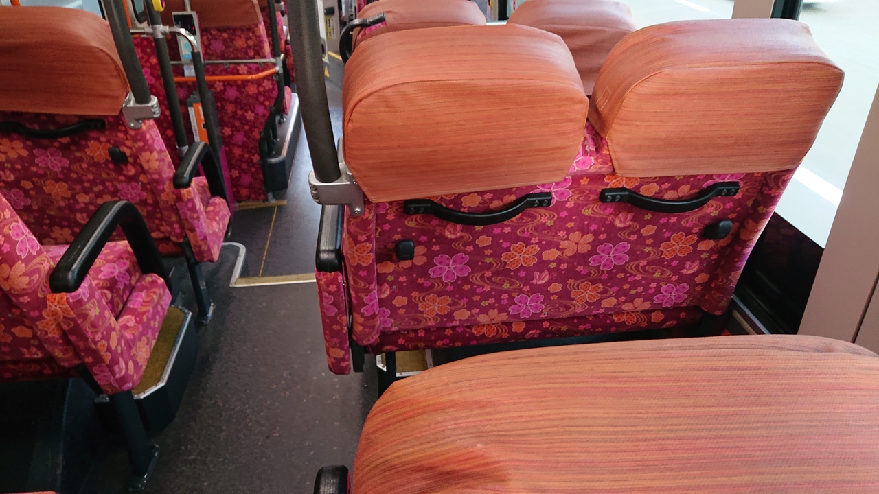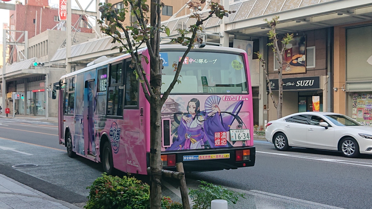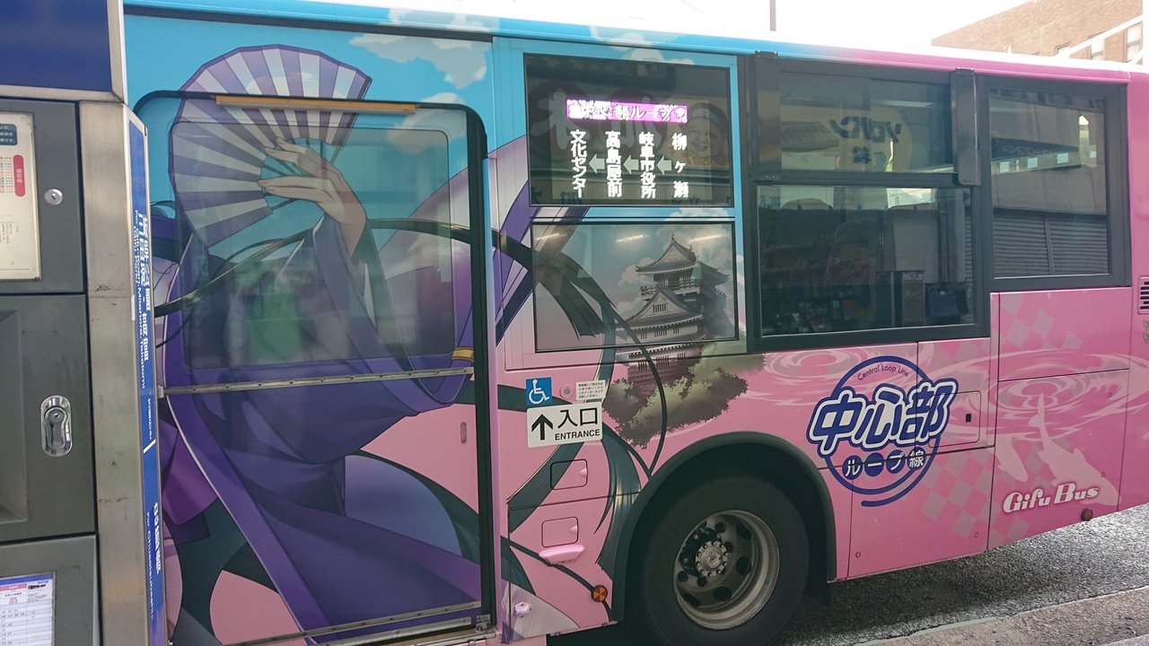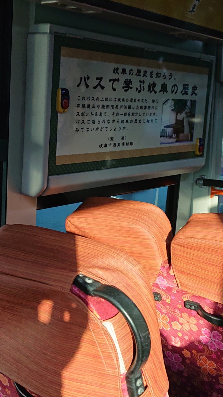 10月下旬の休日午後4時台に、中心部ループ線を利用し、JR岐阜から柳ヶ瀬バス停まで移動しました。その際乗車したのが、濃姫バス。外観には、濃姫のアニメーションが描かれていました。また、椅子も赤色基調で華やかでした。さらに、車内側面には、岐阜の歴史についての表示がなされていました。総合的に見て、路線バスでありながら、大変ユニークなバスだな、と感じました。