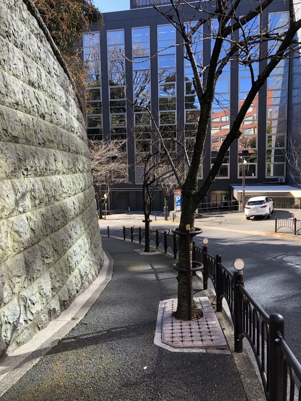 赤坂の山王坂の坂下から直進して、山王日枝神社の北から西にかけて回り込む坂が山王切通坂です。外堀通りの交差点、山王坂下から日比谷高校の崖下を迂回するようにして続いています。江戸時代の外堀通りは溜池の幅が広く渡船で神社に渡っていたので、この坂は明治以降に造られたようです。