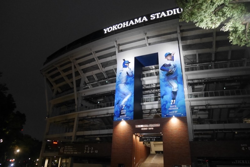 ベイスターズの本拠地です。今回は宿泊したホテルがここの近くだったので夜さんぽにて訪れました。以前こちらへライブで訪れたことがありますが、そのときよりきれいになってる?!と思いました。出入り口まわりがとくに顕著です。周囲には選手の大きな看板が何枚も掲げられていて、すでにシーズンが終わったこの夜も、しっかりとライトアップされていました。