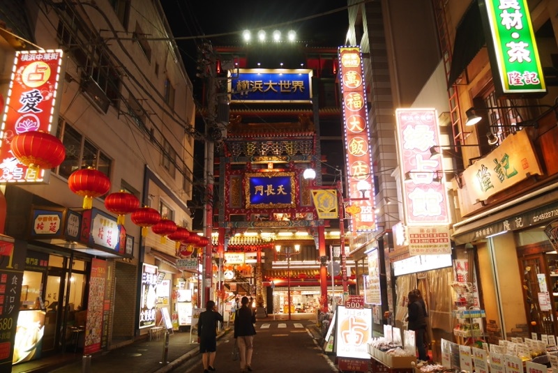 横浜中華街の門のうちのひとつ。小規模なほうの門です。ショッピングビルの横浜大世界が門のすぐ外側にあり、内側(=門の名前が書いてある)のほうから見ると、この大世界のロゴが中華街の門を意識してつくられたことに気づきます。門のうえに、もうひとつ門があるみたい。ユニークな門です。