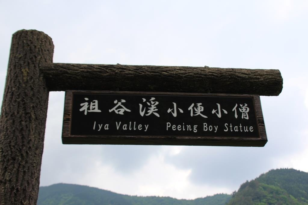 千仞の谷を見下ろす岩の上から放水ポーズの小便小僧。