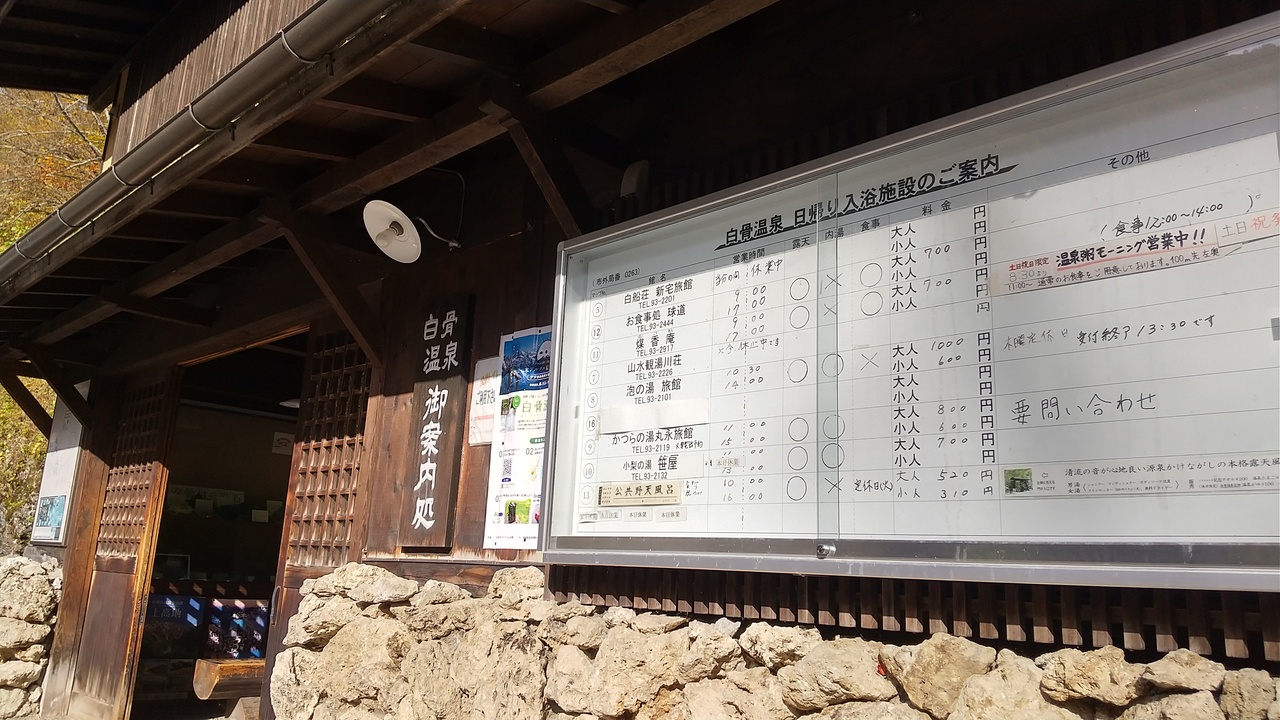 観光案内所には日帰り温泉可能なお宿と料金の一覧が案内板に表示されています。